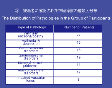 このスライドに示されているとおり、被曝者には若い人が多いのです。そして、そのうちの多くの人が神経系の問題を抱えています。次のスライドをお願いします。 この表には、どのような神経障害が被曝者にあるかが示されています。エンセファロパシー、無力症、心血管障害、性的障害、そして筋肉障害などです。