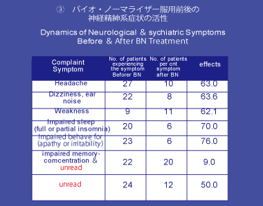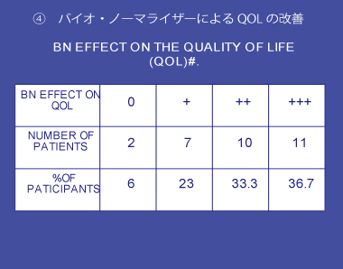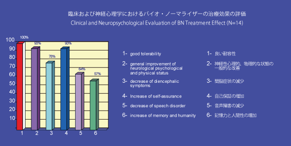 もう一つ別のこともわかりました。この2番目のグラフは、脳内の生化学的反応が生じている部分に損傷がある患者の状態をあらわしています。このような患者たちに対して、バイオ・ノーマライザーの正常化作用が強く働いています。ほかの部分が損傷している患者に対する作用よりも、はっきりと強くあらわれています。このことから、バイオ・ノーマライザーが血液脳関門を通り抜けて、脳の生化学システムに直接作用していると考えることができます。代謝を活発にさせる作用によって、脳だけではなく、全身の機能を高める働きをする。したがってQOLが改善されると考えられるわけです。 以上の研究に基づいて、次のように結論づけてもよいと思います。すなわち、バイオ・ノーマライザーはさまざまな外傷に効くばかりでなく、脳の機能障害にも効果があると考えられます。