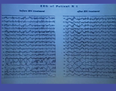このグラフは、脳の機能状態を測定したものです。バイオ・ノーマライザー投与後、発作の回数の減少、そして脳波の正常化が見られます。左が治療前の異常な脳波です。右は治療後のグラフです。これでは振幅が小さくなっています。このことからも、バイオ・ノーマライザーはさまざまな脳機能障害に効果があることが証明されます。