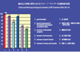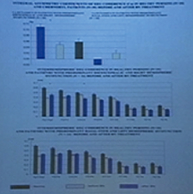 生体電気の分析結果を数学的に処理したものです。この結果からも、バイオ・ノーマライザーによって脳の機能が改善されることがわかります。赤い部分は脳の機能的結合を示しています。投与前と比べて、投与後、その部分が拡大していることがわかります。何もしていないときや、脳に何らかの負荷が与えられたときに、脳がどのくらい働いているかを調べたわけですが、バイオ・ノーマライザー投与後、脳の機能状態は明らかによくなっています。 次のスライドです。これも脳の生体電気的分析の結果を数学的に処理し、平均値を求めたものです。世界中で認められた方法で、体の状態を体温計ではかるように、非常にわかりやすい形で脳の状態を測定するという方法です。この白い棒グラフが正常な脳ですが、チェルノブイリの被曝者には、異常に大きな値と異常に小さな値の両方が見られます。もちろん、それは治療前です。バイオ・ノーマライザー投与後、値が正常値に近づいていることがわかります。ここから、バイオ・ノーマライザーが正常化させる役割を果たしていることがわかるわけです。つまり、バイオ・ノーマライザーは、ノーマルにするという名前のとおりの働きをしているわけですね。実際にノーマルな値に接近していることがごらんいただけると思います。